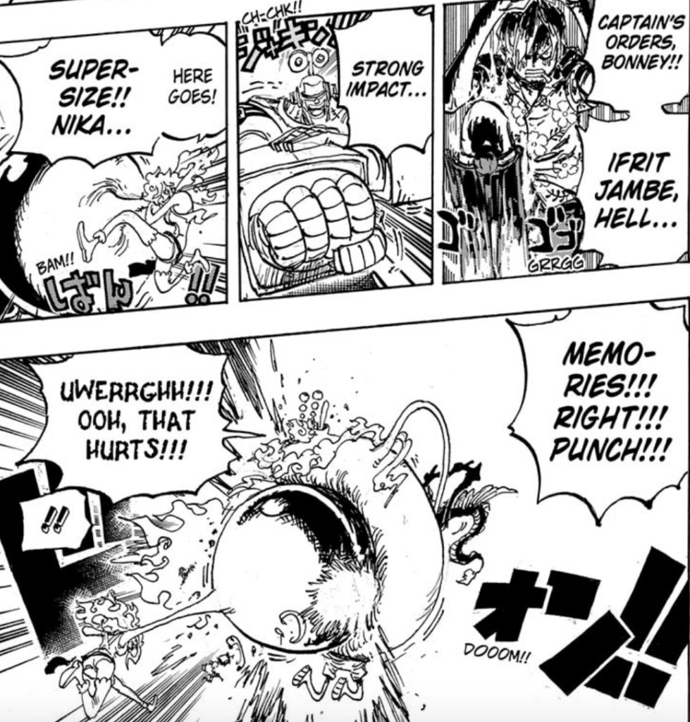 Speaking of Bonney’s attack as well, she calls her version of Gear 3rd “Extra Large Nika Punch”, being a pun in Japanese on extra large servings for meals, given her obsession with food. In this case we can also see she is charging it with armament haki, confirming her as an armament haki user, which is incredibly impressive considering she’s only 12 years old.