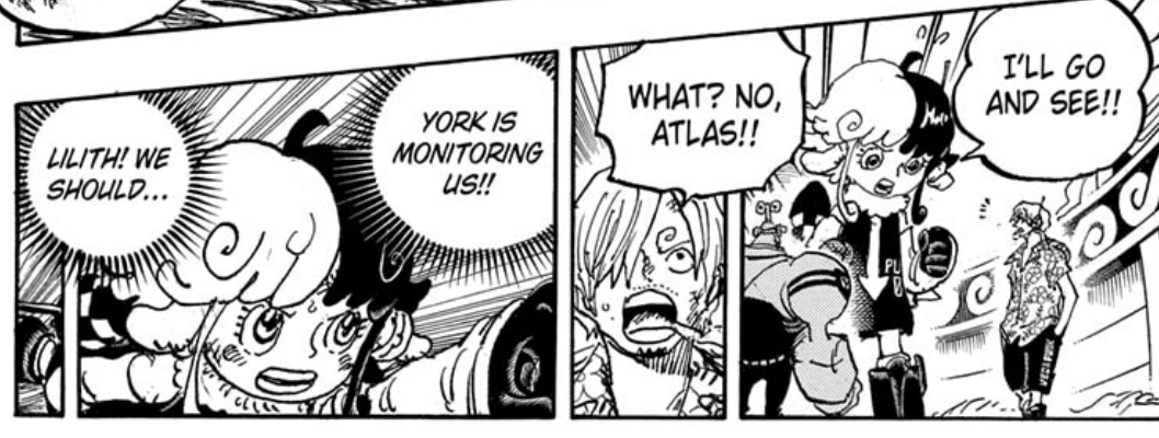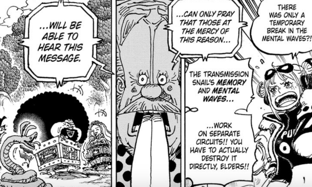 Beyond them we also get to see Gaimon and Sarfunkel on Rare Animal Island, alongside their animal friends cocox and usagihebi, though they don’t seem to be aware of the call, as they likely wouldn’t have a den den mushi. This is likely intended, as in the same panel Vegapunk exclaims “I pray that, at any costs, this message can be delivered”, which in this case it isn’t being delivered to them, even if they likely aren’t the target audience.