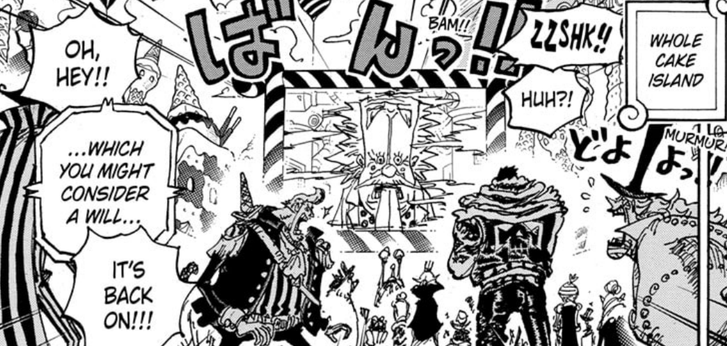 However, surprise! As the iron giant reaches the sea floor and stabilizes itself, the transmission den den mushi begins communicating again! With it we get a few more reactions across the world. First is Whole Cake Island, in the middle of Sweet City, with the Whole Cake Chateau partially visible in the background. The screen itself is also made of candy canes. We see several Charlottes reacting, including Charlotte Katakuri, but also 32nd son Charlotte Brownie, 16th son and Minister of Gelato Charlotte Moscato, 31st son and Minister of Tasting Charlotte Mobile, 28th son and Minister of Seeds Charlotte Kato, 11th son and Minister of Alcohol Charlotte Zuccotto, and 9th daughter and Minister of Meringue Charlotte Broyé, who actually happens to be Brûlée’s younger twin, who unlike her clearly got the better looks, making for quite the interesting dichotomy of witch and princess. Speaking of Katakuri, an important thing to keep in mind about him is that now that Big Mom is seemingly dead, he is the heir to the throne of Totto Land. There was a chapter during Wano where the Charlottes argued if either Katakuri should rule due to his respect in the family, or if Perospero should rule due to being the first son. But since Perospero should be dead as well, the throne falls directly onto Katakuri. Which makes sense, as Totto Land still needs a ruler, and perhaps under Katakuri’s own command, the nation could see an even more prosperous future.