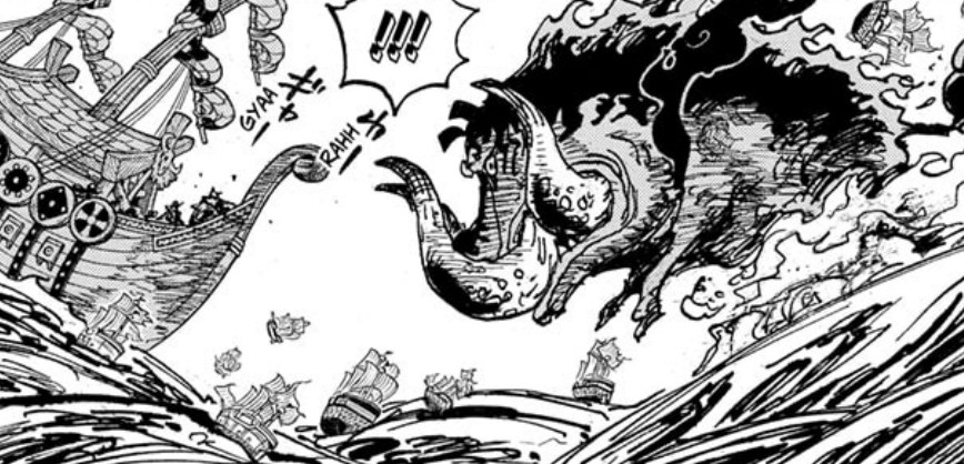 However, as our heroes attempt to escape, Juu Peter throws a bunch of buildings and Cipher Pol members down like a fountain, continuing off from where we saw him previously sucking them up. This also means that the Seraphim might drop in the proximity of the Straw Hats, once again causing potential trouble if they are freed. Suddenly though, Warcury jumps towards the ship and leaps into the ocean. You may not realize it, but this is in itself a massive plot twist, because here we have what is supposedly a devil fruit user willingly jumping into the water. I obviously don’t think Warcury is just tossing his life away just to be able to hit them, so why is he willing to jump into the water just to stop them? Admittedly the Gorosei seem to regenerate endlessly, but can they survive drowning in this case, devil fruit or not? The thing is, we have to keep in mind that the Gorosei are not traditional devil fruit users… in fact they don’t seem to be fruit users at all, but devils of their own entirely, and we already know they kinda break the rules of devil fruits in several ways. So what if, the Gorosei can even somehow… survive and move in water?