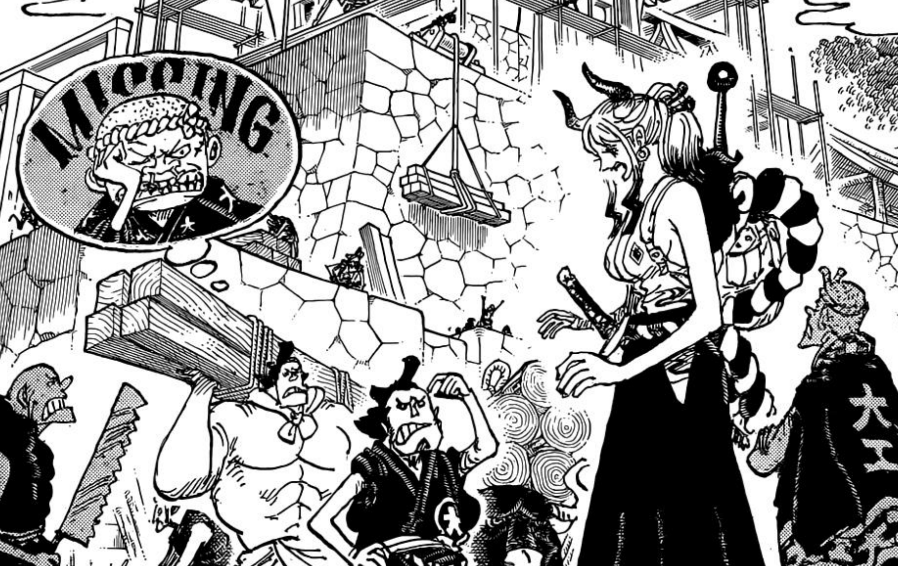 On the covers, Yamato proceeds from the region of Kibi to the region of Kuri, where several mysteries are adding up. For starters, a woman gets assaulted by a dark figure, which runs away and escapes in the foliage. Interestingly this silhouette seems to be slender, like what could be a female, and what seem to be socks are visible on their footwear. At the same time, we see that the people of Wano are trying to rebuild Oden Castle at the top of Bakura Town in Kuri, after it was destroyed by Kaidou’s Bolo Breath at the start of the arc. As traditional of Japanese architecture, most of the building is being constructed with wood. On the carpenter on the right you can also spot the kanji for “carpenter” on his vest. However, their master carpenter, Minatomo, is missing. If you remember, Minatomo was first seen at the start of the arc training Franky, who was trying to get the blueprints to Kaidou’s Castle in Onigashima, since Minatomo was the one who designed the fortress for Kaidou.