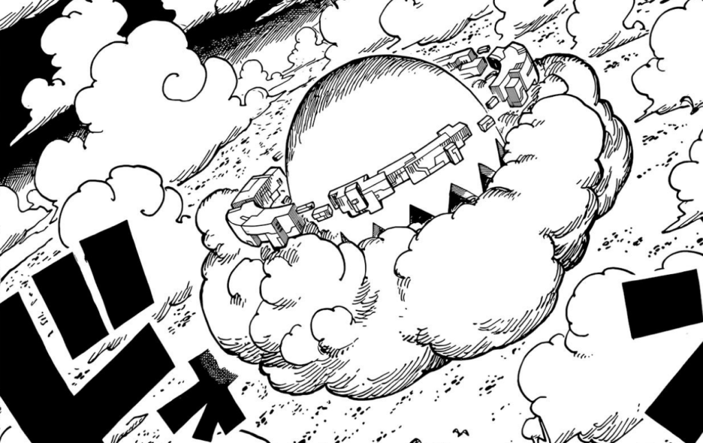 Meanwhile, up at the Labophase, the whole island suddenly begins to rise, being enveloped by island clouds that cause it to elevate further into the sky. York realizes this is the work of Edison, who is still barely clinging on to life in the Fabriophase, having manipulated the island clouds to help the Straw Hats escape, and thus using this to make the Labophase escape into the air by turning it into a mobile sky island. York however notices, and so breaks the connection point between the lower half and top half of the eggshell, causing only the top half to get swallowed up by the clouds. Thus, Vegapunk’s laboratory remains close to Egghead, and with it the Power Plant that York needs. However, the top half of the eggshell, inside which is Punk Records, the massive brain if you remember, went up into the sky, getting away. And with it, any mechanisms and tech that were included in the Punk Records room, though this seems to appear limited as most of the lab was under the shell.