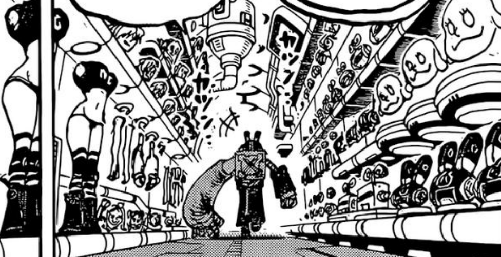 As the new island that is Punk Records flies away, we hear the Punks talking within Punk Records itself. We can also see in this panel that the sky looks dark, which could be for effect but I wonder if it’s trying to represent them being close to the edge of the atmosphere. Regardless, this is likely what Lilith meant last chapter, that the other Punks are still there, and despite having physically died, they are still around. This is because as we see in this chapter, their bodies are purely mechanic, simply being made by several parts being strung together and being controlled remotely from Punk Records, like a remotely controlled robot. It was alluded that this was the case with Atlas, but it is evident now that this is the case with all the other punks as well, even someone like York who was showing so much skin, as we see here that said skin is entirely synthetic. This makes it extra amusing that Vegapunk essentially designed all of the Satellites to look however he wanted, which also includes seemingly enjoying inhabiting the bodies of cute anime girls.