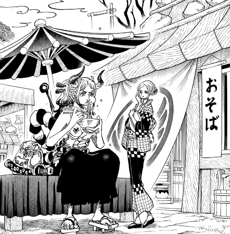 On the cover, we follow Yamato to the outskirts of Bakura Town in Kuri, to Okobore Town, or Leftovers Town, the place where Luffy first met O-Tsuru while trying to rescue Tama. The lady that got rescued serves Yamato some soba, while explaining that the girls from the soba shop all disappeared. Evidently, someone has been kidnapping young ladies, but could also be behind the disappearance of the carpenter Minatomo. What remaining person in Wano could have done this? Could it be someone like Apoo if he still hasn’t left the country? Or perhaps someone more local, like Holed’em? Could it perhaps even be that we are overthinking this and it’s actually Minatomo himself?