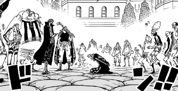 As Shanks mentioned when he was approaching Wano in Chapter 1054, he needed to make an example of Bartolomeo so that other pirates think twice before invading his territory, which we see him do in this chapter. We see several onlookers among the villagers, which if you look closely match the different villagers that we had seen back during Bartolomeo’s cover story, including the large guy they beat up. Among Bartolomeo’s men, you can also spot some familiar faces, as beyond Gambia, his right-hand man, there’s also some other members like the pink-haired guy that tried to remove gum on the deck on their way to Zou.
