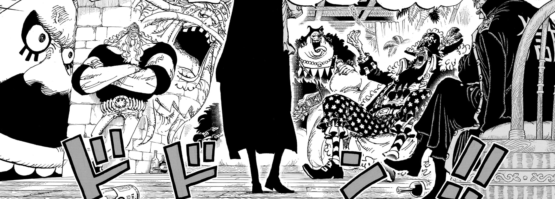 As we move to Hachinosu, where Blackbeard has returned from his battle with Law, he talks about the state of the world, mentioning that now that the poneglyphs aren’t a secret only known by the underworld anymore, the conflict for the One Piece will only escalate, with the major players being the Four Emperors and the Government. This is kinda what we mentioned a long time ago, that the setup of the final saga seems to be a big battle royale clash between the new Four Emperors, Luffy, Shanks, Blackbeard, and Cross Guild, and the forces of the Government, with the Revolutionaries as a wild card. This was recently reflected in the double page spread in Vegapunk’s speech. On the other hand, Law and Kid basically dropped out of the race, not making it as Emperors and eventually getting both crushed, though Law at least has survived.