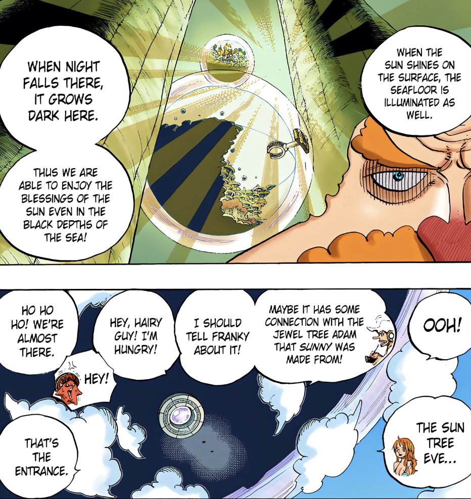 Of course, the connection couldn’t be more obvious. Adam and Eve are the two figures from the tale of Genesis, said to have been in the garden of God but being kicked after the devil deceived them and forced them to eat a forbidden fruit. So what if in the One Piece world there is a similar story of the Devil Imu having deceived the people of the God Country to eat the devil fruits, and thus usurped and took their land. Many have long since speculated that the Elbaph tree was the Treasure Tree Adam, but at the same time many now speculate the Sun Tree Eve could be the tree from where devil fruits originate. Hopefully we’ll soon learn more about the latter and the connection between the two! After all, even Usopp during Fishman Island wondered if there is a connection between the Sun Tree Eve and the Treasure Tree Adam.