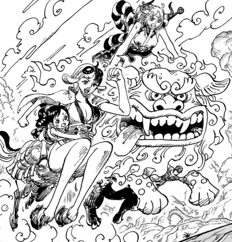 On the cover, we see Yamato riding Komachiyo to locate the thief of the sword. Joining the hunt are Speed and O-Tama, with Speed having decided to stay by O-Tama’s side. Considering that it has been over a month since Speed was first fed at the start of Wano, from March 3rd to around April 9th now, Tama’s powers must’ve worn off, as they only last a month, meaning that Speed has decided to stay at O-Tama’s side out of her own volition. Her clothing is also more like a proper Wano kimono, which makes sense as Speed is originally a citizen of the Wano Country that betrayed her nation for the sake of joining the Beasts Pirates.