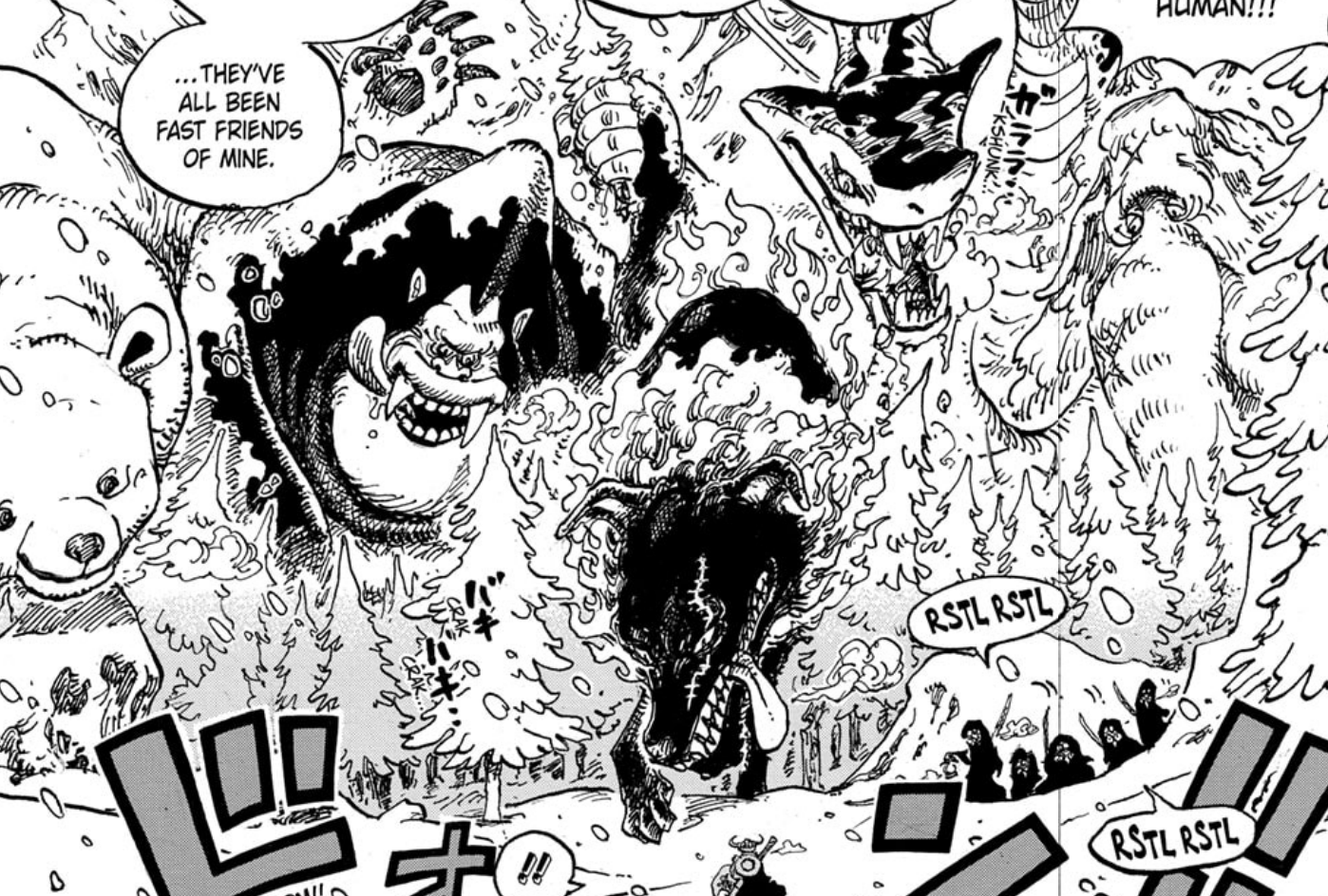 Some of these species might seem slightly familiar though. And if you have good memory, you might realize for example that we’ve already seen the gorilla before, as it was a species we saw during Strong World. Oda has actually already showed some creatures from Strong World across his story, like one of the centipedes from the movie appearing during Totto Land in Chapter 828, so it makes sense that more of them are appearing, as Shiki must’ve gotten them from somewhere, even if slightly unevolved.