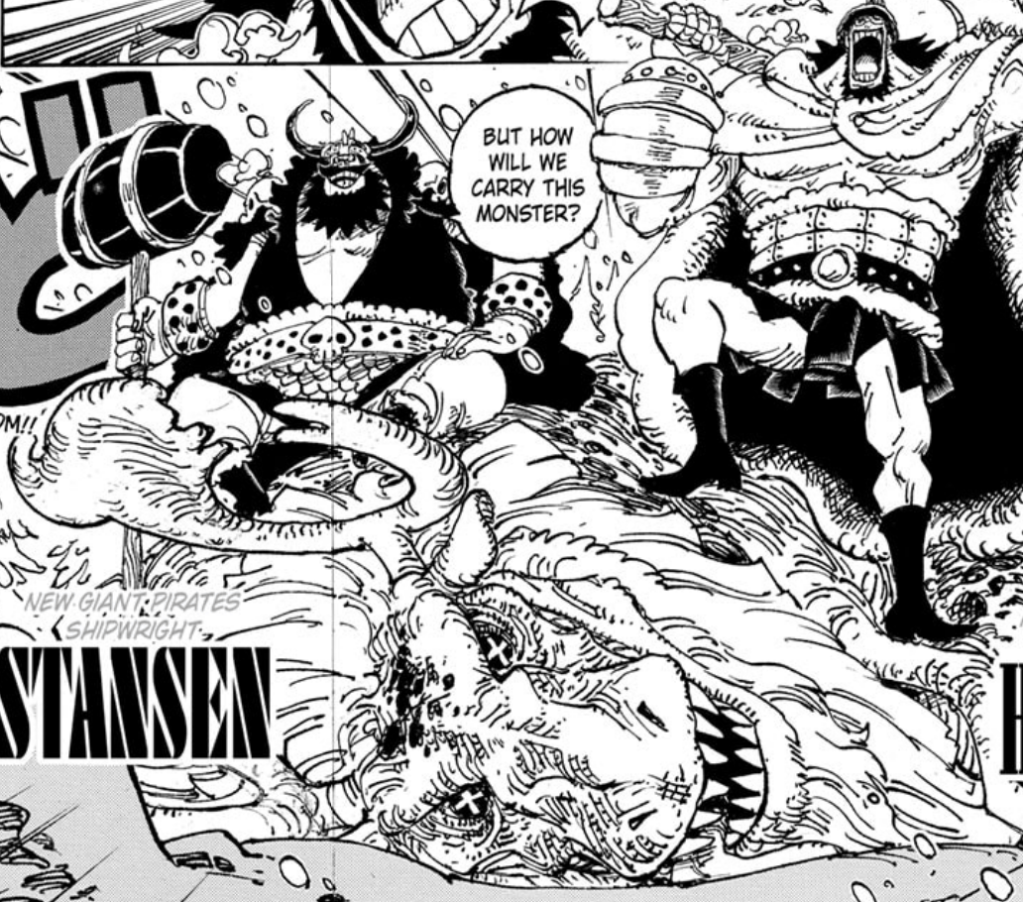 We then get to see the rest of the crew with Hajrudin and the shipwright Stansen. As a reminder, though we are told of Hajrudin’s role in Dress Rosa, Stansen was also the same giant at Sabaody who was at the auction house and was freed by Rayleigh, later getting the chance to return home. The animal they defeated might be familiar as it too is a creature from Strong World: this is known as the Ettousaurus, with the kanji reading as Wintersaurus, which is a cross between a dinosaur and a reindeer, living in cold climates as suggested by its name. Hajrudin simply calls it a “herajika” though, which is the Japanese word for “moose”, even if it isn’t quite one. He also states that he is hunting it to serve its meat to the Straw Hats.