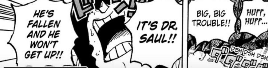 However, as they prepare to make landfall, something happened. A giant comes in screaming on the upper levels where the town is, claiming that Saul-sensei has collapsed and can’t move. Now first of all, Saul here is referred to as “sensei”. This is something that was already hinted at during Egghead, when Dorry and Brogy seemingly referred to Saul as a “scholar”. “Sensei” as you likely know is a honorific referring to someone who is a teacher or master in some craft, so in this case he would be “Professor Saul”. This would make sense, as he was the one who preserved the research and Library of Ohara, so it makes sense if he tried to educate himself to become a scholar and understand more about the Void Century. However in this case he has seemingly collapsed, or “taoreta” in Japanese, “to fall”, and can’t move due to some reason. Just what happened to him? And who is this giant bearing the news whose face is covered? What about the mysterious silhouette we saw a while ago at Elbaph? I suppose these mysteries will explain themselves soon as we get into the thick of the Elbaph arc!
