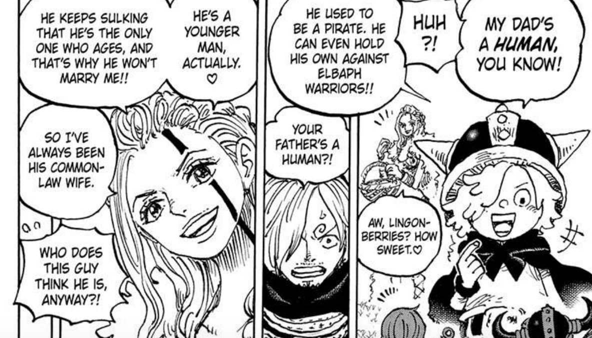 Collon attempts to get a hit on Luffy, but he easily counters with an elephant gun, showing that he was just testing him to witness his strength, being a kid who is still in love with the strength of the giants of Elbaph, hence why he asked Shanks to take him on his ship with him. We also find out what the delivery the bartender made for Collon, which she claimed was the favorite food of his father and Ripley (in Ripley’s case being cowberries), showing that the two are in fact Collon’s parents. By the way, we also get the name of the bartender, being “Mato”.