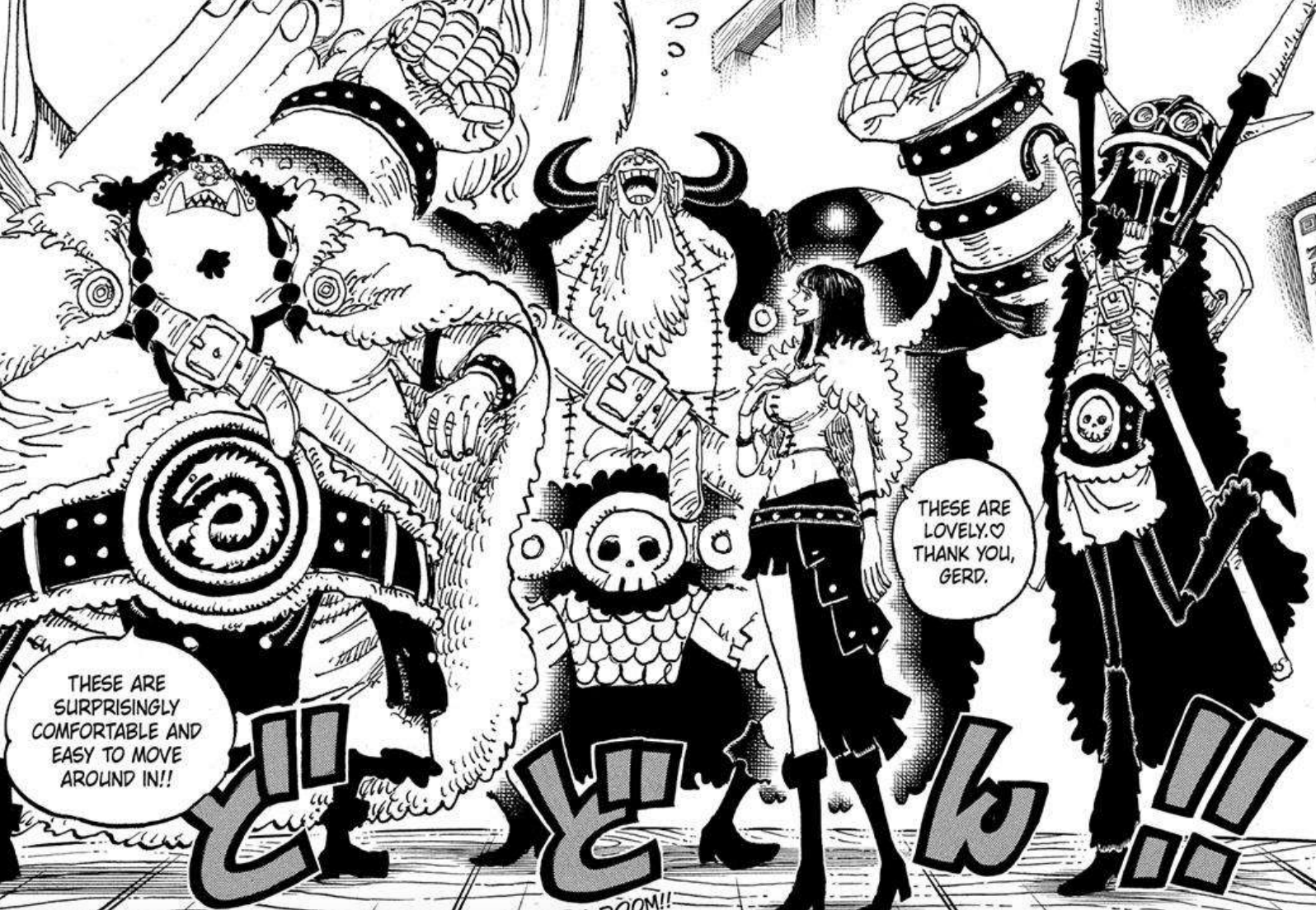 Robin’s party, which includes Chopper, Vegpaunk, and Bonney, decide to remain at the library with Saul, essentially splitting up the Straw Hats once again. While they believe this to be just momentary, with the upcoming chaos this is likely to develop into something more serious. Franky also mentions an interest in the Treasure Tree Adam, hoping to get a better look at it, potentially suggesting he might split off as well.