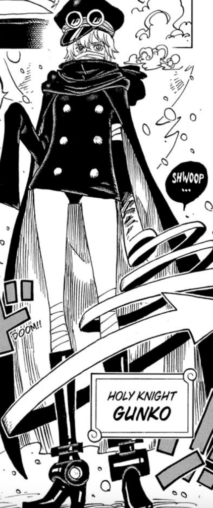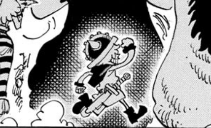 Here, we get a brief but much needed update on our intruders. Our dear Shonks doesn’t seem to do much this chapter, with the only thing we can really gaze from him being a sword that he appears to have at his hip. This sword is in the same shape as the Gryphon, Shanks’s sword, which is similar to Garling’s blade as well as the sword that was used by the silhouette appearing at the end of Vegapunk’s speech who we already had assumed was likely Shanks’s evil doppelgänger.