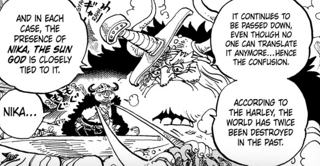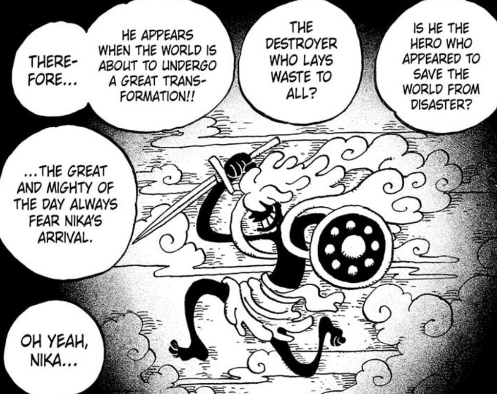 Moving on from this mind-bending reveal though, Jarul adds a very interesting comment about Nika: “Is he a hero who appears to protect the world from being broken apart further? Or is he a destroyer seeking to break it all? At the very least, when the world’s very shape is changed, those are the time when he appears!! Therefore, those in power at the time fear the possible appearance of Nika”. Once again, he presents the concept of duality, where Nika is perceived by some as a liberator and bringer of hope while others see him as a bringer of destruction. To be fair, this makes sense. Nika has always appeared during times where the world’s very shape has been changed as he says, but we also know for a fact that Joyboy was heavily involved with the ancient weapons during the Void Century. From what we currently historically understand, Joyboy seemingly had good intentions, and meant to use the ancient weapons for a change for good, but perhaps the very fact that he was in possession of them at some point may have confused the records that would remain of him with some conflating him for a destroyer rather than a savior. After all, even Vegapunk said the same thing that he couldn’t judge if Joyboy was meant to be an agent for good or evil.