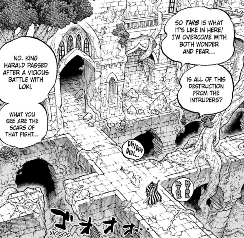 On the inside, we get to see how truly colossal this castle is. While it may not seem as imposing on the outside, inside it is composed by several levels and large halls, to the point Zoro even mentions it’s hard to see the roof. And yet the castle has fallen into disrepair, ravaged by the fight between Loki and Harald, its ruins now being taken over by the vines of the Adam Tree. On one of the columns we can also see the inscription of what appears to be a skull.