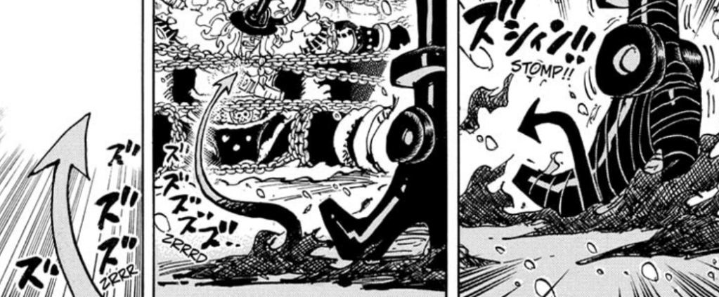 Getting too tired to walk, Nami relies on Road to take her, while Zoro also takes the opportunity. Luffy instead rushes ahead himself, seeing him hop on one of the swords from the fallen giants. They walk into a hall covered in skulls, and among them Luffy notices some that have horns on them. This makes them similar to ancient giants, the special race that Oars pertained to. However, the difference is that ancient giants have different traits, such as colored skin, sharp teeth, and especially being triple the size of normal giants. While the average giant is around 20 meters, Oars and Little Oars Jr. were over 60 meters tall. These skulls however don’t look anywhere near as big as that, instead being closer to the size of a normal giant.