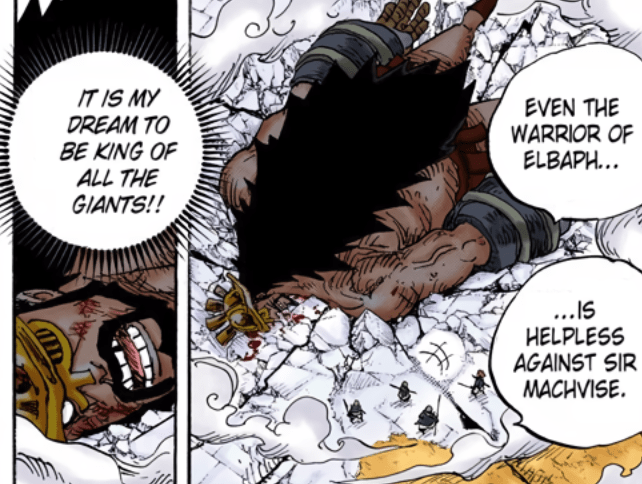 However, it seems the royalty of Elbaph were quite prideful about their pure bloodline, and so Hajrudin couldn’t become king, leaving Elbaph in this awkward frozen state without king. However, Hajrudin has wanted to prove himself, and not just become king of Elbaph, but take advantage of his mixed blood to become the king of all giants. This isn’t a new thing in fact, this is something we’ve known for over a decade, because if you go back to Dress Rosa, this is literally what Hajrudin says. He claimed that if he could get his hands on the Mera Mera no Mi, Ace’s Flame-Flame Fruit, then he could be powerful enough to become the king of all giants.