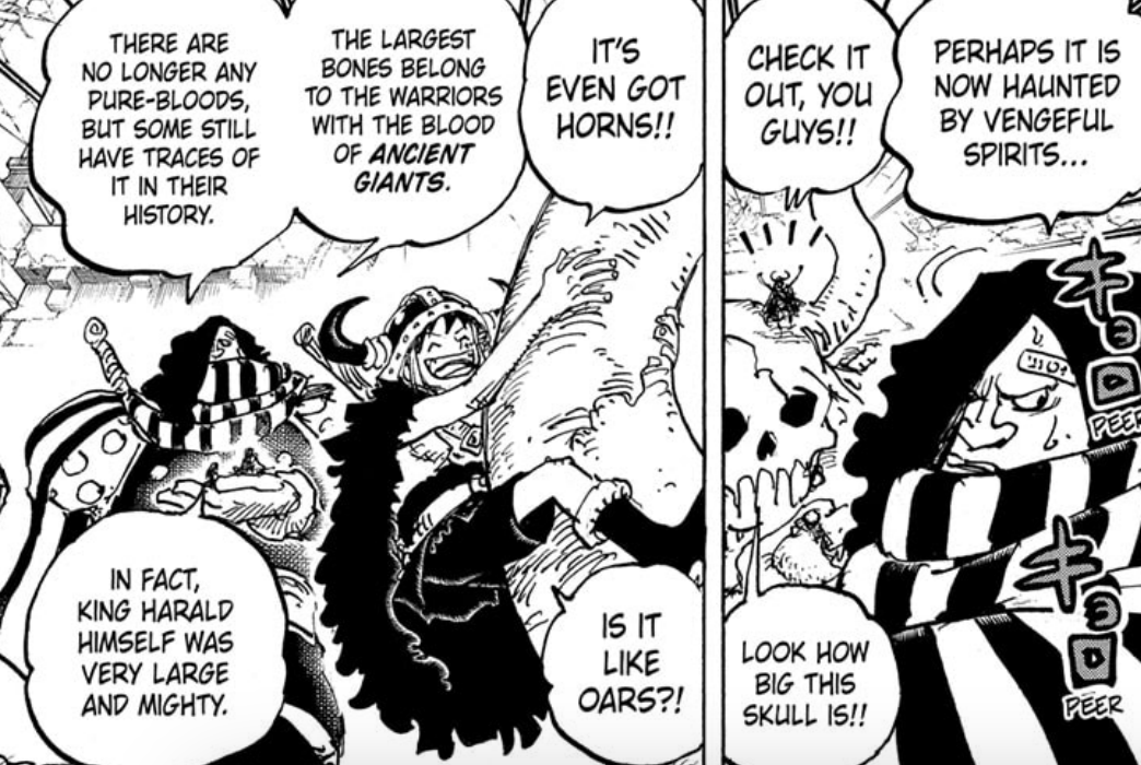Getting too tired to walk, Nami relies on Road to take her, while Zoro also takes the opportunity. Luffy instead rushes ahead himself, seeing him hop on one of the swords from the fallen giants. They walk into a hall covered in skulls, and among them Luffy notices some that have horns on them. This makes them similar to ancient giants, the special race that Oars pertained to. However, the difference is that ancient giants have different traits, such as colored skin, sharp teeth, and especially being triple the size of normal giants. While the average giant is around 20 meters, Oars and Little Oars Jr. were over 60 meters tall. These skulls however don’t look anywhere near as big as that, instead being closer to the size of a normal giant.