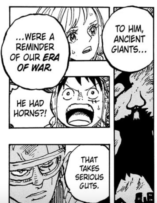 Regardless, that term of oni was always there, and even in the current cover story we have right now, Yamato is referred to as “Oni Child” (with a gender neutral term in this case just as Kaido used it). And fundamentally, what I’m getting at, is that now we have more evidence than ever that these horns are in fact a trait of a half-hybrid race. So the reality is that oni like Kaidou may actually be a half-human half-ancient giant hybrid. This would explain why Kaidou, and even later Yamato, are both really tall, but also have these natural horns. Oda did once explain that the Gifters of Kaidou’s crew wear fake decorative horns, but we’ve seen the likes of not just Kaidou and Yamato, but also Blackmaria, Ulti, Page One, and potentially Who’s-Who seem to have actual real horns. So does Sasaki, but that’s just due to him being a bluespine unicorn fish-man, so he’s a separate case.