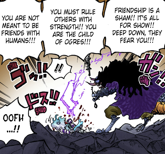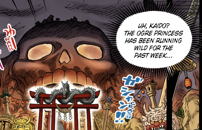 Now this could maybe be a coincidence, but maybe… also not. Kaidou’s race has always been a point of contention among fans and scholars, because it’s never been fully clear. There was a scene where Kaidou told Yamato that “You are the child of oni!!! You are not meant to be friends with humans!!!”, which would suggest that the race Yamato and Kaidou pertain to are called “oni”. Oni of course refers to the ogre-like creatures from Japanese culture with big horns and of large stature. However, it’s never been fully clear if this was meant literally, that oni are an actual race, or if it was a metaphorical comment. After all, being called the “child of oni” could be just a metaphorical comment about them being different, so fans have often debated whether “oni” is an actual race or if they’re just humans who happen to have horns.