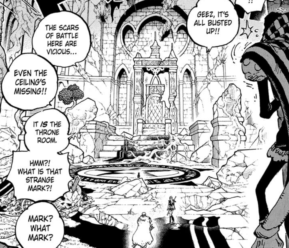 Luffy also recalls having seen the circle somewhere, as he clearly saw it during the Egghead Incident when the Gorosei spawned in, but can’t quite recall as usual. The group suddenly hears a voice, and Road grows scared and starts chanting the expression “shizumari tamae” (寝まりたまえ), which is essentially a ritual chant to ask spirits to begone, fundamentally meaning “go back to resting”. As they are stopped by a giant axe, Road drops Luffy, Nami, and Zoro, but Luffy grabs her with his arm to help her out and drops her onto Zoro.