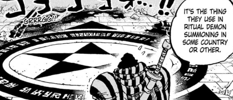 Road spots said magic circle, which the Straw Hats don’t see at first since they struggle to see it from ground level, so they hop on his hand. Nami claims that she has read in a book before about these magic circles, claiming that in some far off country, they do rituals to try and summon devils. It’s worth noting that the Japanese word for “magic” used here, mahoujin (魔法陣), uses the kanji for “devil”, because magic was associated with devilish witchcraft, so in a sense this “magic circle” also literally refers to being a devil-invoking circle.