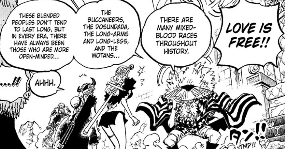 He begins talking about mixed races in the world of One Piece, mentioning the buccaneers, the dosundada, the longarmlegnecks, the watans, and so on. So I thought I’d take the opportunity to go over all the races and hybrid races in the world of One Piece. These races are often translated by some fans as “tribes”, but the word “zoku” 族 here is more accurately translatable as “race”.