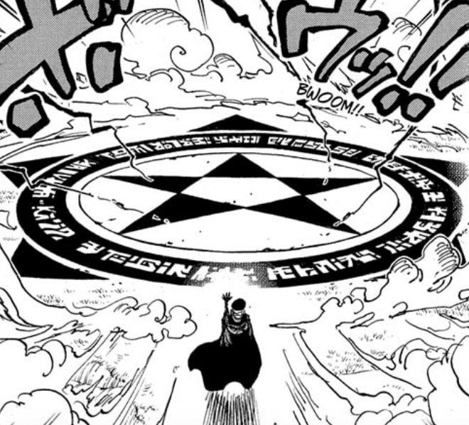 Interestingly, as Nami mentioned last chapter, the people of Harahettania tried using these circles to summon the Devil through them, as this might be a practice that they may have picked up after witnessing a real Abyss being used. From the Abyss we see in several panels the sound effects “bari bari”, which represent the cracking of thunder and have often been used when Conqueror’s haki has been used (though also in other contexts), perhaps associating the black lightning with the same seen when haki is used.