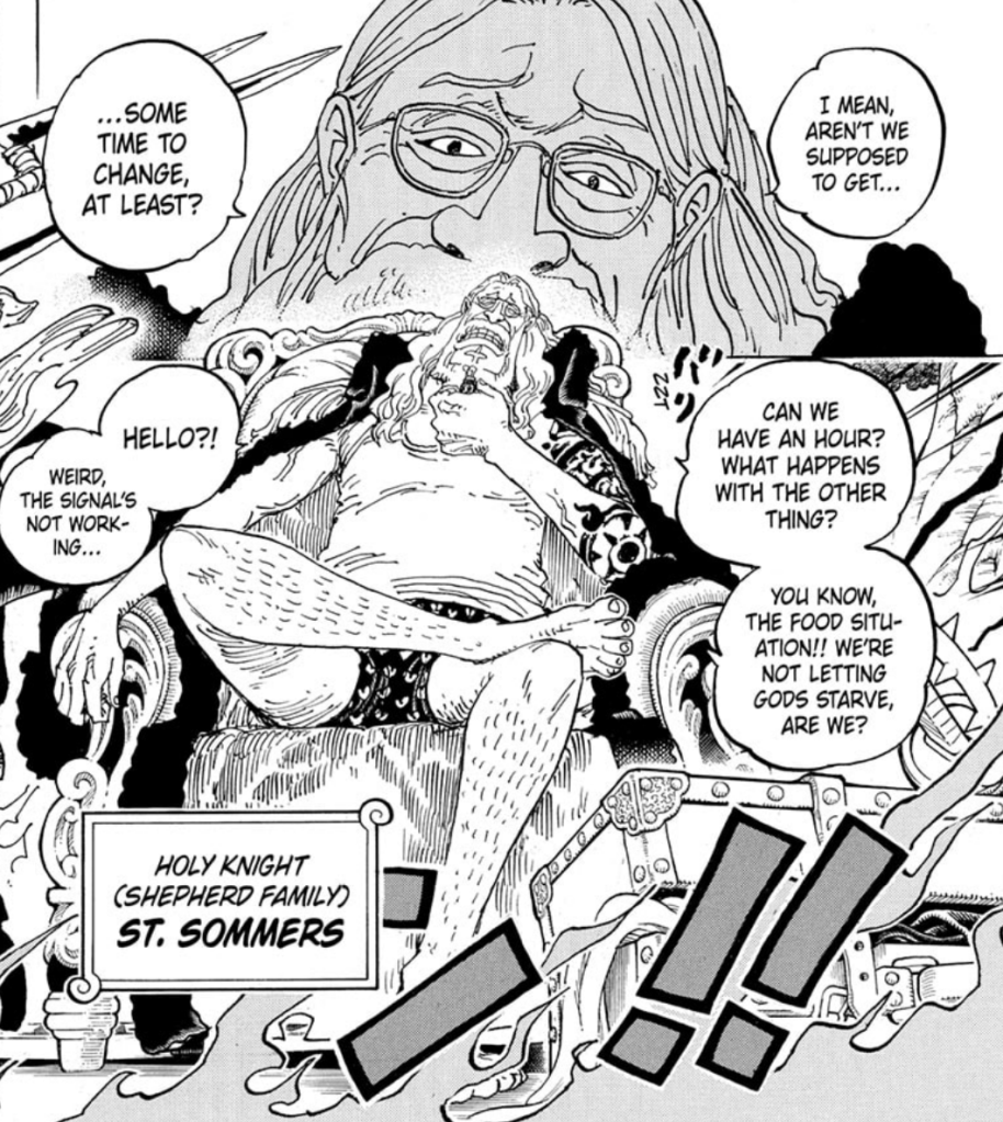 Sommers however has been summoned pretty suddenly, to the point he was still talking on his den den mushi about having received orders to go to Elbaph, as evidenced by the baby den den mushi he’s carrying now not working anymore due to being out of Mary Geoise range. Perhaps more evident is the fact he’s comfortably sitting on his opulent couch in his heart-patterned underwear, only carrying a tanktop but a cape on top of it just to feel more majestic. Gunko gets pretty embarassed by him being in his underwear that she blushes and turns away and he still thinks that he’s in his home until he realizes that he’s in Elbaph. Alongside him also spawned in a chest, which happens to have clothing he suits himself up with, and his sword.