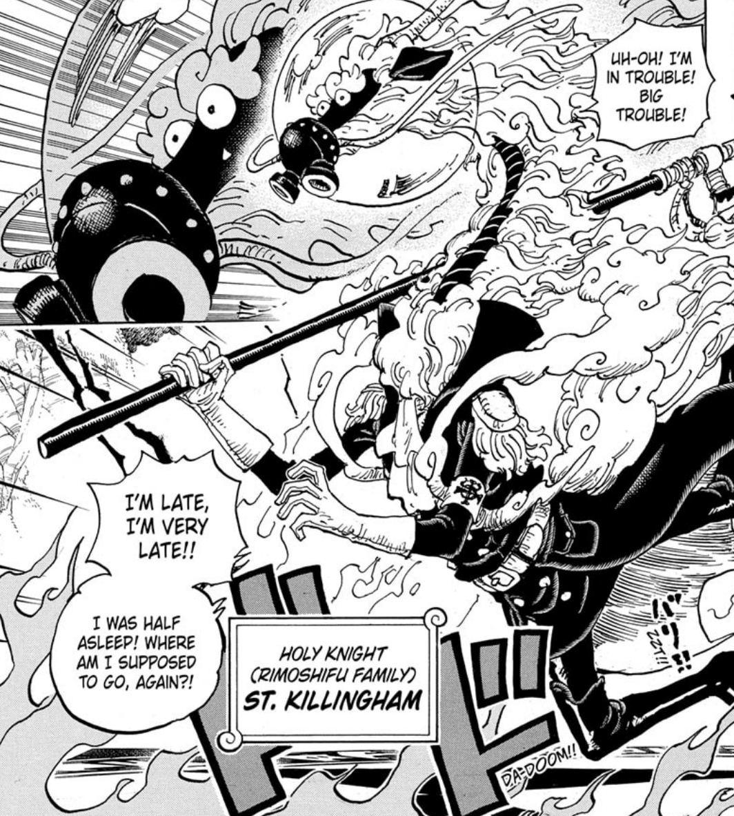 The other God Knight is St. Rimoshifu Kiringham. His family name, “Rimoshifu” is actually a new name we haven’t gotten before, being a newly revealed name for one of the Celestial Dragon families. We previously had half of them known, being Nerona, Nefertari, Donquixote, Figarland, Manmeyer, Jaygarcia, Marcus, Topman, Ethanbaron, and Shepherd, but with this one we now know 11 out of 20, and I’m sure before the end of the series we’ll find out all of them. Since it’s new though, it’s hard to say how we should romanize it, as in Japanese it’s written as the quite peculiar “Rimoshifu”, which could be anything from Rimoshifu, to Limoshifu, Limosheev, or anything inbetween. Given how he seems to be based on a creature from Chinese mythology, I thus wonder if it could be “Limshifu”, which is an actual Chinese name, but for the moment I’ll keep it as it is in Japanese just to play it safe.