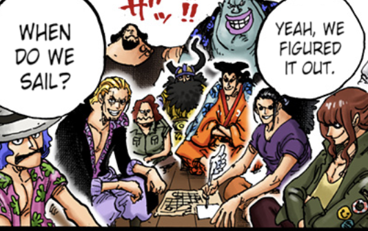 On the cover, Who’s Who has captured two “rebels”, being two shadows collapsing to the ground. While it may be hard to make out at first, these are pretty clearly the silhouettes of Ulti and Page One, and the fact they have been labeled as rebels seems to indicate that they may have tried fighting back against Who’s-Who for control of what remains of the Beasts Pirates, but were defeated by him, putting them in a rough situation now that their adoptive father, Kaidou, is gone. Could this point towards them helping to agree to work with Yamato? Or will Ulti simply be unwilling to get over her grudge?