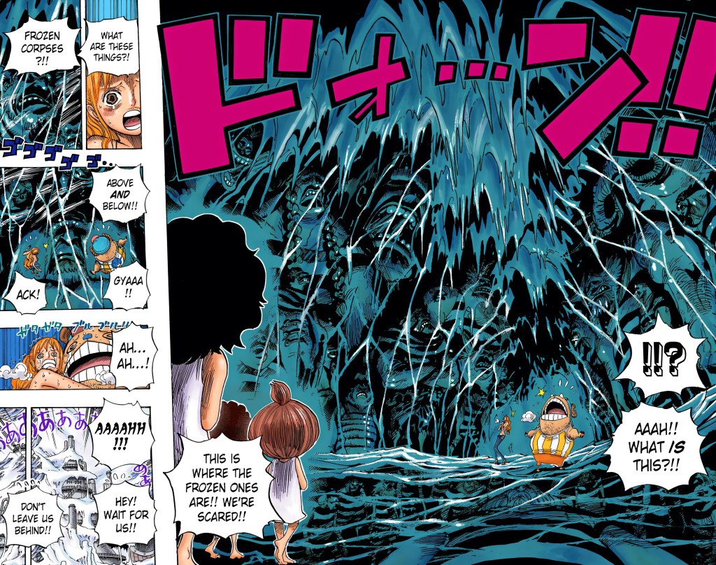 Coincidentally, Jarul also mentions about rumors he’s heard of a group of giants that was frozen somewhere out there in the world and this might be the hint we need to figure out the identity of the Galleila, as this is very reminiscent of the “frozen ones”. You might remember that on the island of Punk Hazard, on the first floor of Building B, Nami and Chopper, alongside the kids, ran into a room of the “frozen ones”, which included a lot of giants being encased in deep ice. As far as we know, these are prisoners of the Government that were experimented on in Punk Hazard and frozen in ice for preservation. However, if you compare them to the silhouettes of the Galleila, it becomes quite evident they are one and the same. The large ancient giant in the background looks a lot like the big face on the top left with an open mouth. The central man with large sideburns matches the man with sideburns on the right, and there’s a couple others you could potentially match as well.