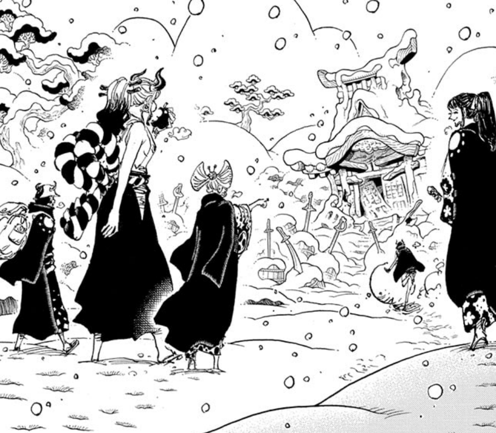 On the cover, O-Chou guides Yamato towards a certain grave, one which she states belongs to a “hero born in West Blue and raised in Ringo”. This is a very interesting statement because if we’re talking of visiting graves in Ringo, what would come to mind at first would be Ryuma’s grave, but the statement of being born in West Blue doesn’t quite fully add up. After all, Ryuma’s vivre card stated that he originates from the Wano Country, but then again that’s as far as we know, so this is information that could absolutely be updated as we find out more about Ryuma’s origins. Much like Zoro, it’s totally possible that Ryuma may have been born abroad in the West Blue and was later raised in the Wano Country, though the fact he was stated to be “raised” seems to indicate whoever this is moved to Wano very early in their life. We do know through Monsters that Ryuma did travel quite a lot in his adulthood but of his youth there’s quite little we know.