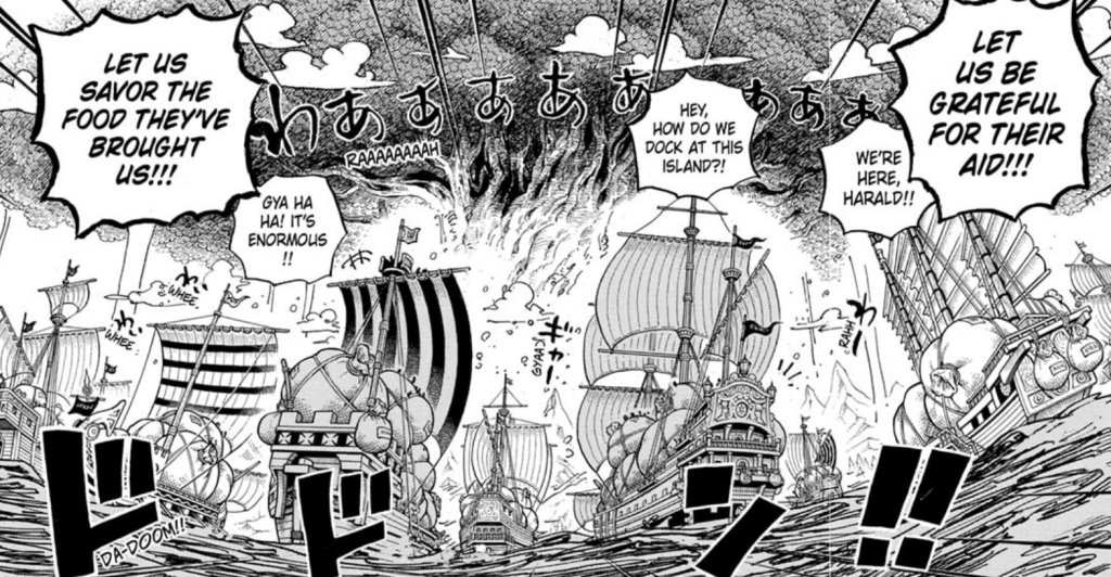 These ships are so packed with food that the bags almost cover entire ships, as they need enough food to feed all the giants, with one of the ships even carrying extra bags on the back of it. Speaking of which, this ship looks a lot like a geobukseon, or a turtle ship, iconic not just to our Korea but also in One Piece the Kano Country, which is inspired by Korea (known in Japanese as the “Kan Country”), so it’s possible that this ship may have come from Kano, all the way in the West Blue impressively enough. Others aren’t quite as recognizable, but interestingly among the men waving to Harald we see one with an outfit with a turban. The design of the clothes is reminiscent of a country that we saw fell to war during Doflamingo’s arms trade in the future, perhaps a harrowing evolution of this country that once helped Harald, but the design is generic enough that you could also compare it to that of Dadan’s bandits among others. Furthermore, Harald’s quote of “we live in a small world” is quite befitting given what realization he came to after Ida told him that he was simply born big, realizing how tiny perhaps he and his world really are in the great scope of things.