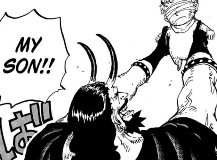 But of course the most striking appearance of all is finally seeing the debut of the legendary Rocks D. Xebec, a whole 7 years after his name was first mentioned in Chapter 907 during the Levely in 2018. As we’d seen in silhouettes, he’s not as tall as Whitebeard, and similarly his hair is spiked, though it splits into different colors, one dark and one brighter. He has some sort of tattoo or mark over his left eye, but most strikingly, he of course looks a lot like Marshall D. Teach, making it quite clear that he is the father of Blackbeard. This was already largely assumed by fans as Xebec had a lot of connections with Blackbeard, primarily the fact that his son eventually took over his territory of Pirate Island Hachinosu and Teach’s current ship is known as the “Saber of Xebec”, with Oda even having largely alluded directly in interviews in the past the two are connected in some way or another. But all of this lends more value to Saturn’s claim that Blackbeard is special due to his lineage in his talk with Devon and Augur, as he likely knew he is Xebec’s son.
