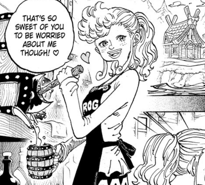 In the meantime, we see that Ida instead went to the Underworld to open the tavern found at the shores of the island she calls “Ida’s Bar” (イーダの酒場), where beasts are said to usually not come to. She states that she wants to do it to more easily welcome people to the island, in hopes of helping Harald’s dream, but I wonder if nearly being killed in her village made her want to keep some distance too, perhaps. Fittingly she bears an apron with what seems to be the writing “grog”, and is pouring some beverage from a barrel through some sort of lodged axe or lever. She instead sends Hajrudin to live with “Elbow”-san (or “erubo-” エルボー in Japanese) from the West Village to train to become a warrior. Given how so many giants bear names related to wrestling, this could perhaps tie to the iconic elbow drop, known by the same name in Japanese. However, the concerning thing is that currently Ida is not in charge of the tavern, but instead is now run by another woman named Mato, as we saw in the present Collon and Shanks hanging out in this tavern. So I wonder what the relationship is between the two and, most importantly, where exactly is Ida at present?