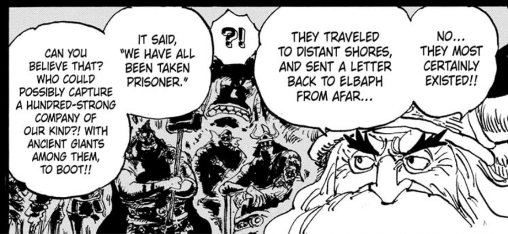 We can give a reasonable explanation for this as well: the Galleila could’ve eventually been captured by the Government and thus taken to Punk Hazard to be experimented on due to their strong lineage, as we know for a very long time the Government had been interested in attaining giant strength for their army and thus spent a lot of time investigating giantification. This was before Vegapunk took place in Punk Hazard, but likely the frozen ones would remain frozen for a very long time until his research eventually came along. Regardless, it is from these experiments on ancient giants that the first artificial ancient giants were created on Punk Hazard. These ancient giants would then fall into Caesar Clown’s hands after the fall of Punk Hazard who would sell them to Kaidou, to become his elite unit: the Numbers, thus tying all of these plotlines together. The real question, however, is who exactly defeated the Galleila, to capture them all, particularly given their tremendous strength as Jarul mentions, so this must’ve been an incredibly powerful person working for the Government, or eventually handing somehow these giants to the Government. After all, Harald also wonders if this was work of the Government, though Jarul makes mention of how any details of the past were sunk in the waves of history, of course an allusion to the sinking of the world.