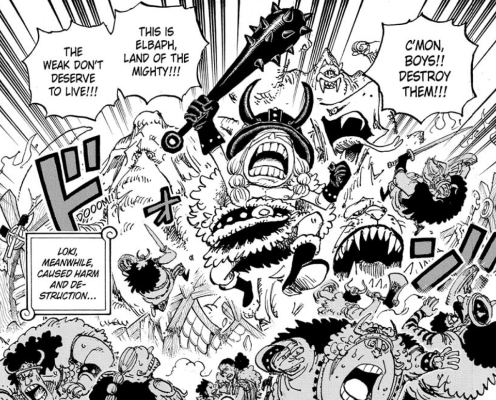 48 years ago, while Loki is now 15 years old, but still a kid in giant years, he unleashes the beasts of the Underworld on the West Village while his father is away on an expedition. This isn’t the first time he’s done it, as we were told he did this exact same thing at 10 years of age, so it became a common reoccurence. With him we see he has a bunch of creatures from the Underworld, including a Del Kong, a Dasoku, a Mammoth Dense, and a Fat Lion, as well as later a wolf similar to the one Gunko would later kill and an Ettosaurus, which he refers to all as “men”, basically treating them like a pirate crew. We see a familiar scene where Loki beats up on Hajrudin again, but we see the future New Giant Warrior Pirates (only missing Road, who perhaps was still bullied at the time) and other villagers rushing to his aid, including Gerd asking for first aid, which I wonder if it may have inspired her desire in wishing to become a doctor when she was healing Hajrudin. Loki insults Hajrudin’s mother by calling him the “son of a dirty mother”, which refers to the offense he mentioned in the present being hurt by.