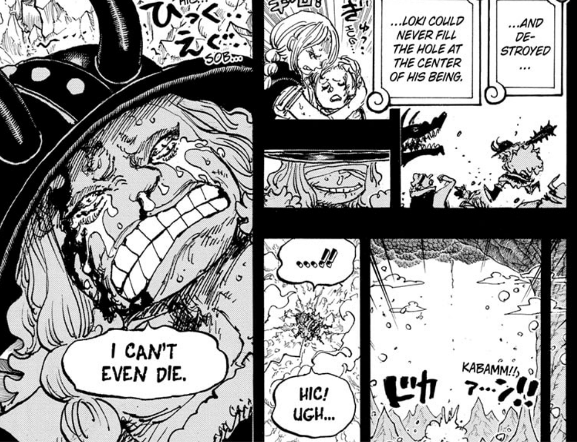 And yet, so strong is he born that even while doing this, he does not lose his life, and wallowing in his misery he exclaims “I can’t even die right”. In Japanese this expression, which gives title to the chapter, is read as “死ねもしねェ” (shine mo shinee), which combines “shine”, to die, with “shinee”, a modified version of “shinai”, which means not being able to, in order to create a poignant alliteration. As Loki feels so worthless that even taking his own life isn’t something he can do right.