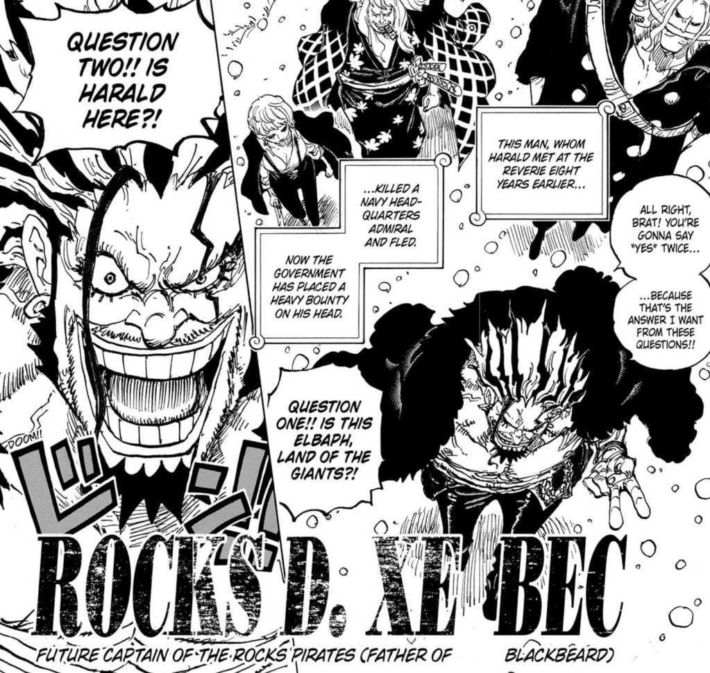 However, even though Xebec still hasn’t quite achieved the height of his prime that would define the Era of Rocks, a period of time that is said to have ended 38 years ago with the God Valley Incident but we don’t know exactly when it began, he’s clearly accomplished quite a lot already. 8 years earlier, during the same Levely Harald and Jarul mentioned, he seemingly waltzed into the Levely and killed a Marine Admiral all on his own, then going on the run from the Government and attaining a high bounty, though we don’t quite yet know the amount. Admirals usually serve as the guards for the Levely, so the fact that Xebec murdered one goes to show how powerful he truly was even before the height of his prime, being a man that very much rivaled the strength of even the likes of Roger and Garp, becoming the boss of Pirate Island and establishing the legendary Rocks Pirates, to attain his ultimate goal of becoming “King of the World”. A title we now know is not metaphorical, but a very real desire to usurp Imu’s current position. However, his goals would be foiled at the God Valley Incident, when he supposedly would die after losing to Roger and Garp, completely altering the course of history.