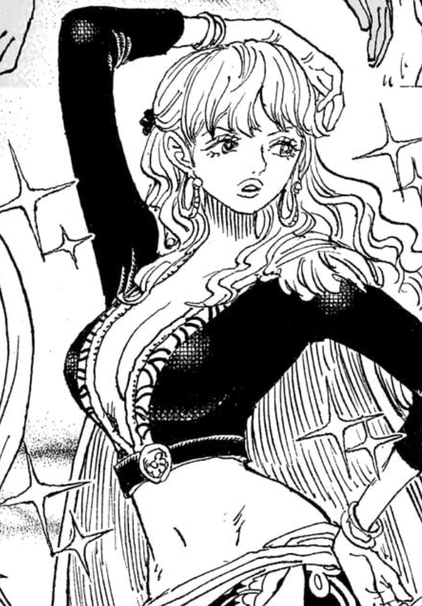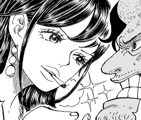 In her vivre card long ago, it was said that Shakky was once a really powerful pirate, and I’ll be damned if we don’t see that here, managing to overpower someone like Roger, though clearly thanks to her beauty rather than a fully fair match. We see that her appearance is quite similar all things considered, with the wing like flaps on her neck matching those of her current oufit, still smoking all the time, but with loger hair similar to Hancock’s in the present.
