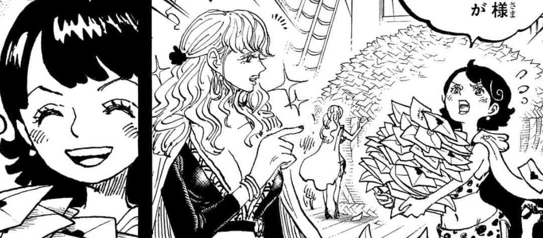 She isn’t the only one to be so admired however, because while she receives a bunch of fan letters, many of which seem to be actual love letters given the heart seals on them, Shakky gets even more letters in a far larger basket. The one managing the letters here is a young Tritoma, who would serve as future empress of Amazon Lily before Hancock. As a reminder, at present the current empress is, of course, Hancock. The one who came before her is Tritoma, who was previously only mentioned in an SBS but we finally get to see here. Then before that was Shakky, and before that Gloriosa, and we see here the period in which Gloriosa was captain and Shakky vice-captain before she eventually took over. Each of their names, like all from Amazon Lily, are derived from flowers: the Gloriosa flower, also known as the fire lily, the shakuyaku flower, or the peony, the tritoma flower, or red hot poker, and the hancock flower, or the asiatic lily. In fact, Shakuyaku being named after a flower was a big hint to her identity as a kuja long before it had been confirmed. We also see this referenced in this chapter as despite the use of the word “idol” phonetically, the kanji reading for that word reads as “高嶺の花” (takane no hana), which means “flowers beyond reach”.