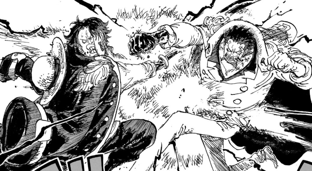 We see Roger and Garp clashing with each other, both using advanced conqueror’s haki to the point that they don’t even touch each other. Interestingly though, Roger appears to be hitting Garp backwards with the blunt side of his sword, maybe because he doesn’t want to kill him but rather just wants to whack him really hard.