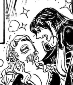 However, another party joins the fray, being Monkey D. Garp, who pursued Roger many times in the past as we were told, but if you remember, Shakky claimed that in her days as a pirate she also had been chased by Garp quite a lot, which we finally see here in action. She would eventually however quit piracy altogether 42 years ago, not that long after this point, when she decided to give up on her pirating life to open Shakky’s Rip-Off Bar in Sabaody, where Rayleigh would later join her sometime after Roger’s death. Interestingly, in an SBS, when a fan asked if Shakky was part of the Rocks, Oda very much dodged this question and joked around there being some correlation between the two, which makes me wonder if Shakky did join the Rocks if only very briefly. But perhaps it was just Gloriosa who joined the Rocks, perhaps leading to Shakky taking over Amazon Lily during that time, and that is the connection Oda was alluding to. As the two run away, we see in fact that Gloriosa is suffering from love sickness, with her chest hurting from being rejected by Roger. Shakky calls her “nee-san”, which means “big sister”, seemingly indicating that the two are related, and Shakky is Gloriosa’s little sister.