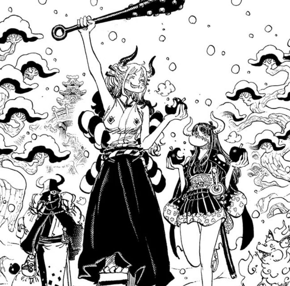On the cover, Yamato decides to head back to the Flower Capital, the business around the country concluded. Ulti and Page One follow along, all of them eating apples, or “ringo”, the namesake of the Ringo region, named after their real life counterpart in Aomori, Tohoku, where apples are a local delicacy (I’ve tried a bunch of them, and believe me, I never knew there were so many different kinds of apple flavors!). These apples also serve however as a strong symbolism for the change of Wano, as we saw Tama eating an apple as Luffy fed her and with how the people of Ebisu were forced to eat the bad apples that are SMILE fruits. Next to them is Onimaru, who appears to be doing well at a strong 69 years, while behind them we can see that the castle of Ringo has seemingly been restored after its destruction.