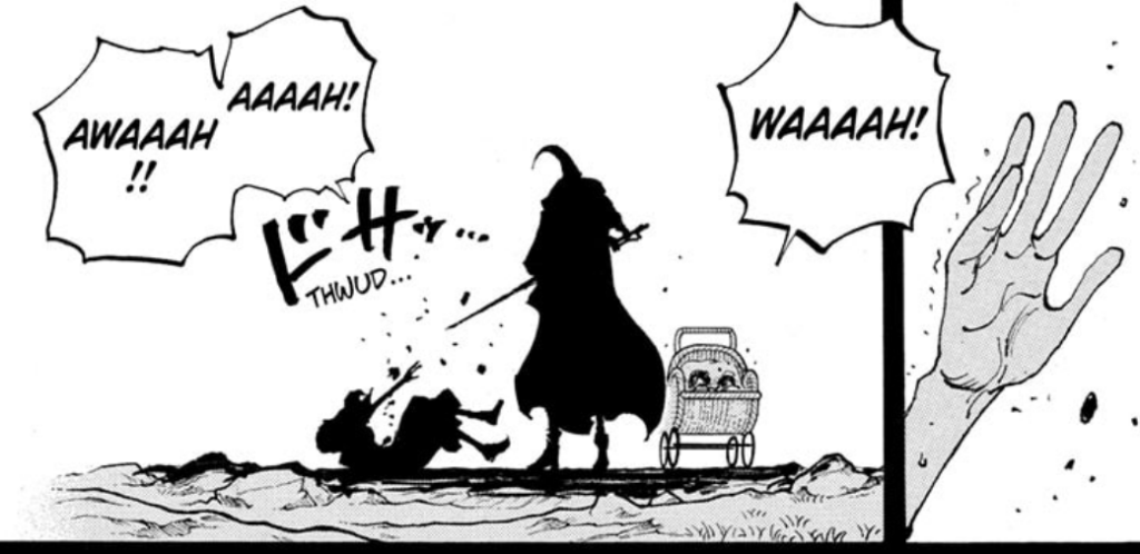 We see a couple more glimpses of a couple other locations: first, we see Dragon stumbling upon a woman bleeding out. It’s hard to say who this is given how small the panel is, but she does say “help my children escape from the island… I don’t want “that person” to have them”. Context here would infer that this might be Shanks and Shamrock’s mother, which would make sense if perhaps Dragon played a hand in helping Shanks escape by locking him in a chest, although Shamrock would eventually end in Garling’s hands… this mother’s wish forever changing the landscape of the future of the world.