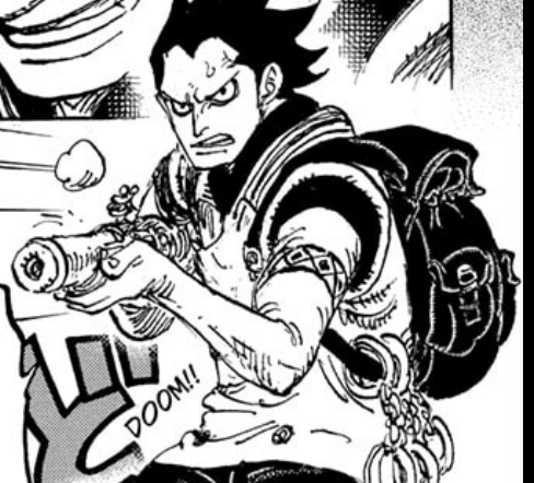 At this point, Dragon is only 17 years old, about the same age Luffy was when he became a pirate. He resembles a bit a younger Luffy, though especially when in Gear 4th. As we were told, Dragon had briefly joined the Marines, as he was likely convinced by his father to become one just like how he tried to make Luffy a Marine too. Dragon however quit soon after joining because he felt disillusioned by the cruelty of the Government. Many of us assumed given the timeline that he likely was at God Valley as a result, and indeed, this is the very moment his worldview was changed, and one of the biggest threats to the Government began to rise, leading him to form the Freedom Fighters and later the Revolutionary Army. However, this also explains how Garp knew about God Valley when Kong mentioned it was so confidential, as he may have heard from his own son, but it’s also possible he might’ve heard it from someone else too. If you look at Dragon’s arm, you can also spot what looks like a tattoo, rather than a bandana given the color, on his arm, which looks exactly like the mark he would later get on his face.