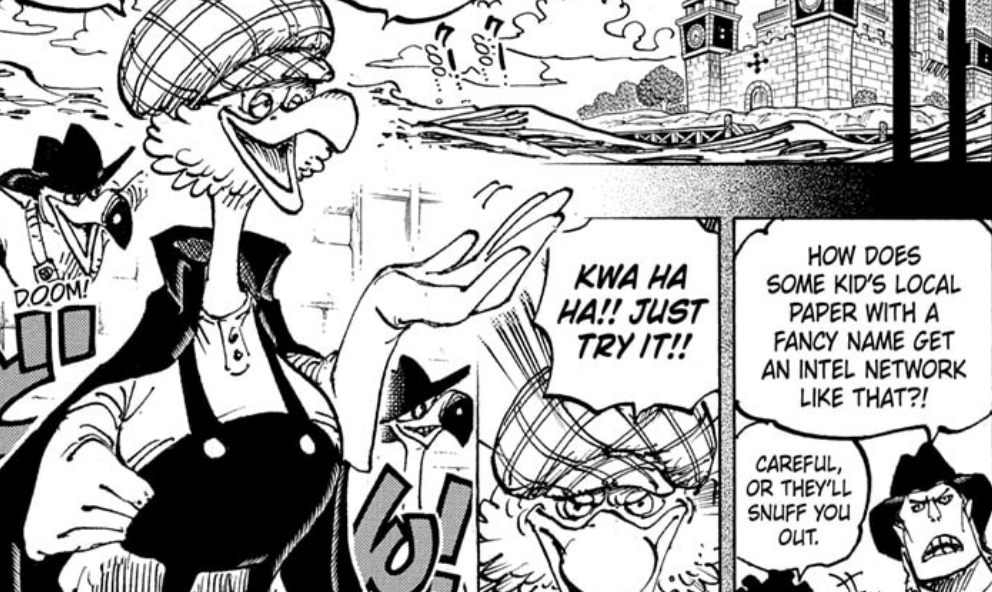 The informant in question in this case turns out to be Morgans, who demands a ransom from the Cipher Pol for keeping secret about the events of the Genocide Tournament he heard from Ginny. As the intelligence officers mention, Morgans is just a kid in charge of a small regional newspaper, which lines up with what we knew from the vivre cards, where we were told that Morgans founded the World Economic Newspaper, but at the same time that he’s also only 53 years old. Meaning that during the incident he was only 15 years old, which felt wierd, but we are told here that no, he was definitely quite the young entrepeneur. It’s possible that the newspapers we saw previously before in the flashback were by different companies before Morgans really became the lead player in the market, primarily as he introduced the News Coo system, allowing for faster delivery of news than before, where they likely may have been shipped through traditional means like ships rather than by bird. His domestication of birds may have been helped by his Tori Tori no Mi (Bird Bird Fruit), Model: Albatross, a fruit he already had at this point as he evidently appears to be, since he prefers keeping his true identity secret due to having too many enemies. Though I have to wonder if he could be someone we know or if we’ll even see his real face.