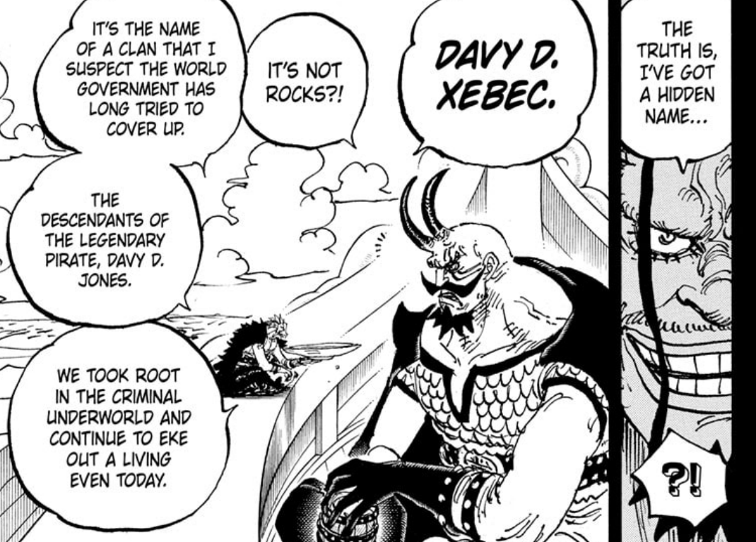 Xebec drops a massive reveal though: his real name is not rocks: rather, it’s Davy D. Xebec. This means that his son isn’t just Rocks D. Teach who likely took his mother’s name as Marshall D. Teach, but in fact his real name would be Davy D. Teach. And the original legendary pirate was in fact Davy D. Jones, a member of the D. clan who was so dangerous to the Government that they tried to erase his entire bloodline even beyond his association with being a D. clan member.